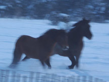 Vikingo, a Paso Fino stallion, and to his right, Danny, a grade Percheron, at play. You can tell they are playing and not angry because their ears are tilted to the sides or straight up. Also they aren't trying to bite or strike each other with their hooves. At the bottom right they end their play fight with a side-by-side gallop.